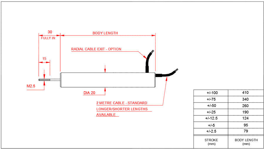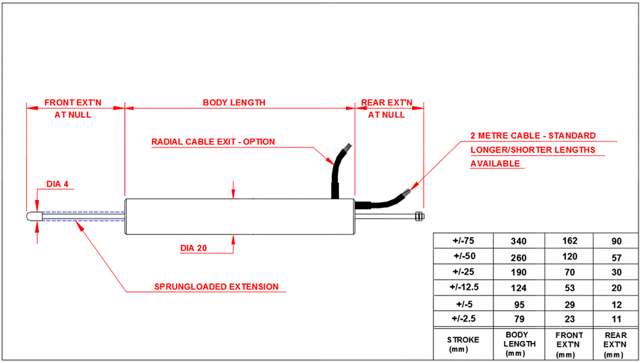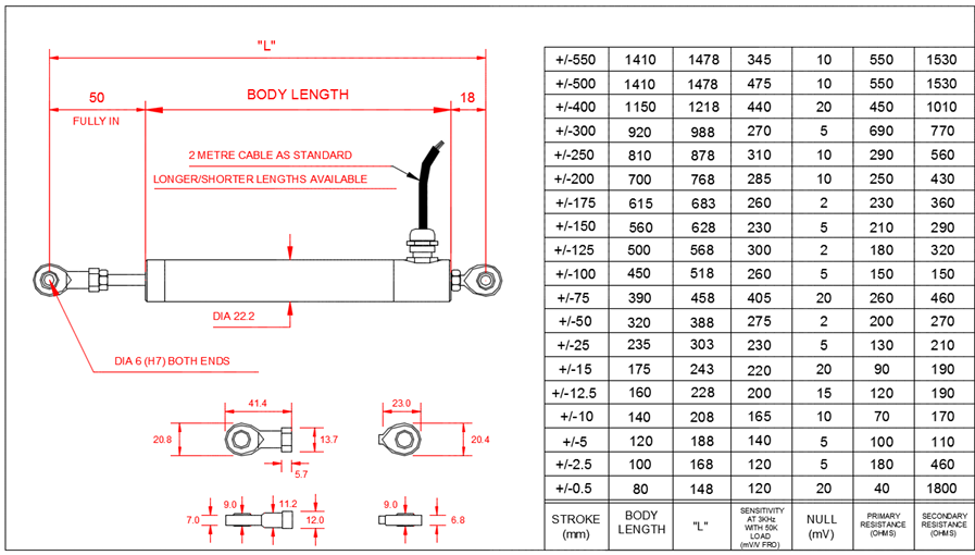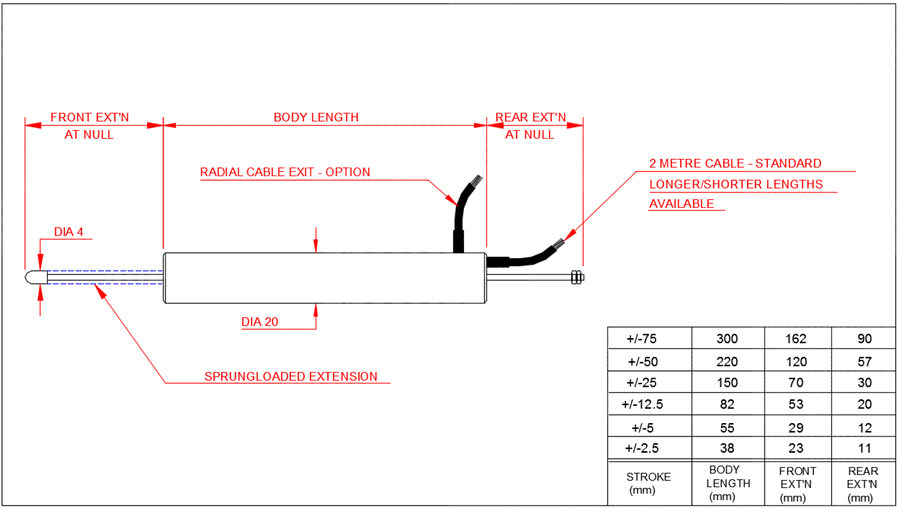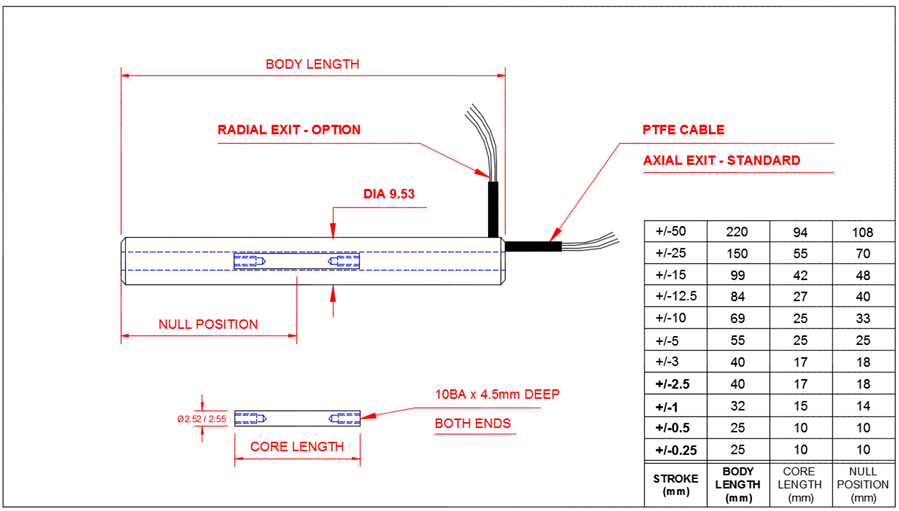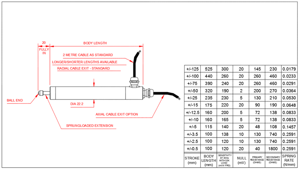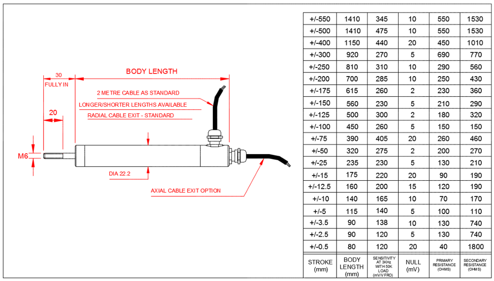 測定範囲は±2.5mmから±100mmまでで、コアタイプはプレーンコア&エクステンション、スピリングロードコア&エクステンション(ストロークは±75mmまで)を選択できます。直線性は±0.5%未満で、出力はDCバイポーラ、0~5V、0~10V、4~20mAを用意しています。