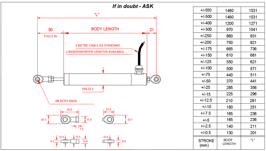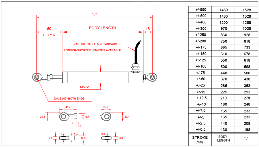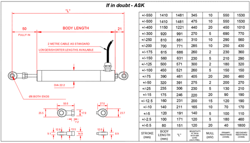 測定範囲は±25mmから±500mm(スリムタイプ±300mmまで)までで、直線性は±0.5%未満です。出力はAC、DCバイポーラ、0~5V、0~10V、4~20mAから選択可能です。