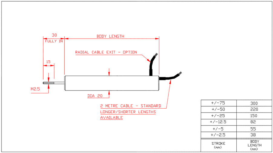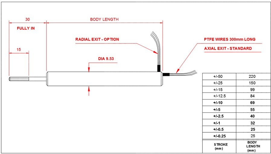 測定範囲は±0.25mmから±50mmまで、直線性は±0.5%未満です。高温対応(150℃)、直線性向上、プレーンコア&エクステンション、スプリングロードコア&エクステンションなどのオプションもご用意しています。出力はACに加え、DCバイポーラ、0~5V、0~10V、4~20mAのLVDTケーブルとインラインで接続可能な外付信号変換ボックス(MTN/8100シリーズ)をご用意しています。