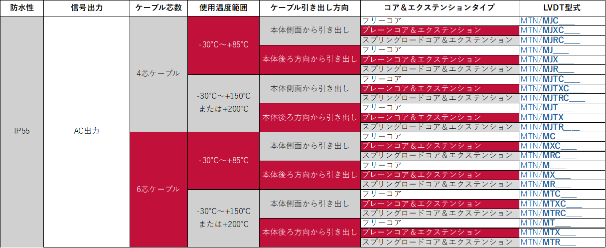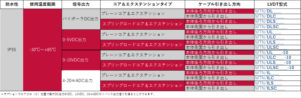 | シリーズ | 使用温度範囲 | 防水性 | 出力信号 | コアタイプ | ストローク |